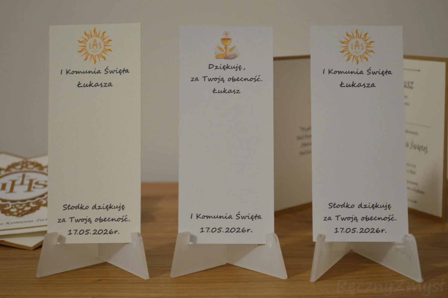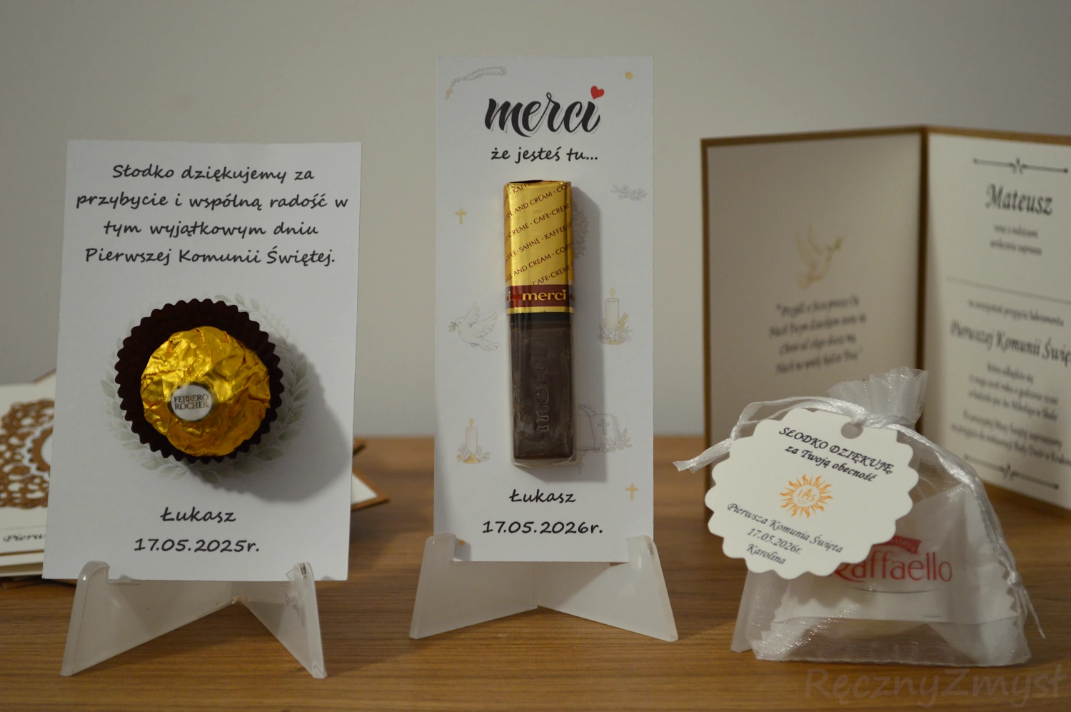 Ręcznie wykonane podziękowania na Pierwszą Komunię Świętą dostępne w różnych wariantach: pod Merci, Raffaello, Ferrero Rocher, prostokątne, kwadratowe oraz woreczki z ozdobną zawieszką. Każdy projekt można w pełni spersonalizować – zmienić treść, kolorystykę i dodatki, dzięki czemu podziękowania staną się elegancką i spójną pamiątką dla gości. Idealne dla rodziców, którzy chcą podkreślić wyjątkowy charakter uroczystości Pierwszej Komunii Świętej.