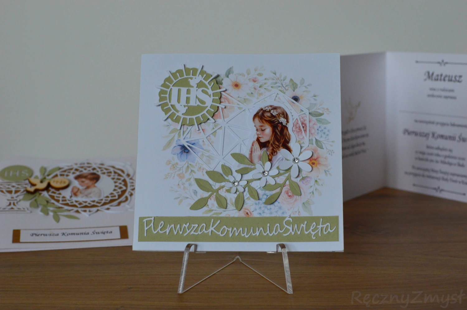 Zaproszenie komunijne z dziewczynką modlącą się - możliwość personalizacji zdjęciaPamiątka Komunia – Dziewczynka z wiankiem