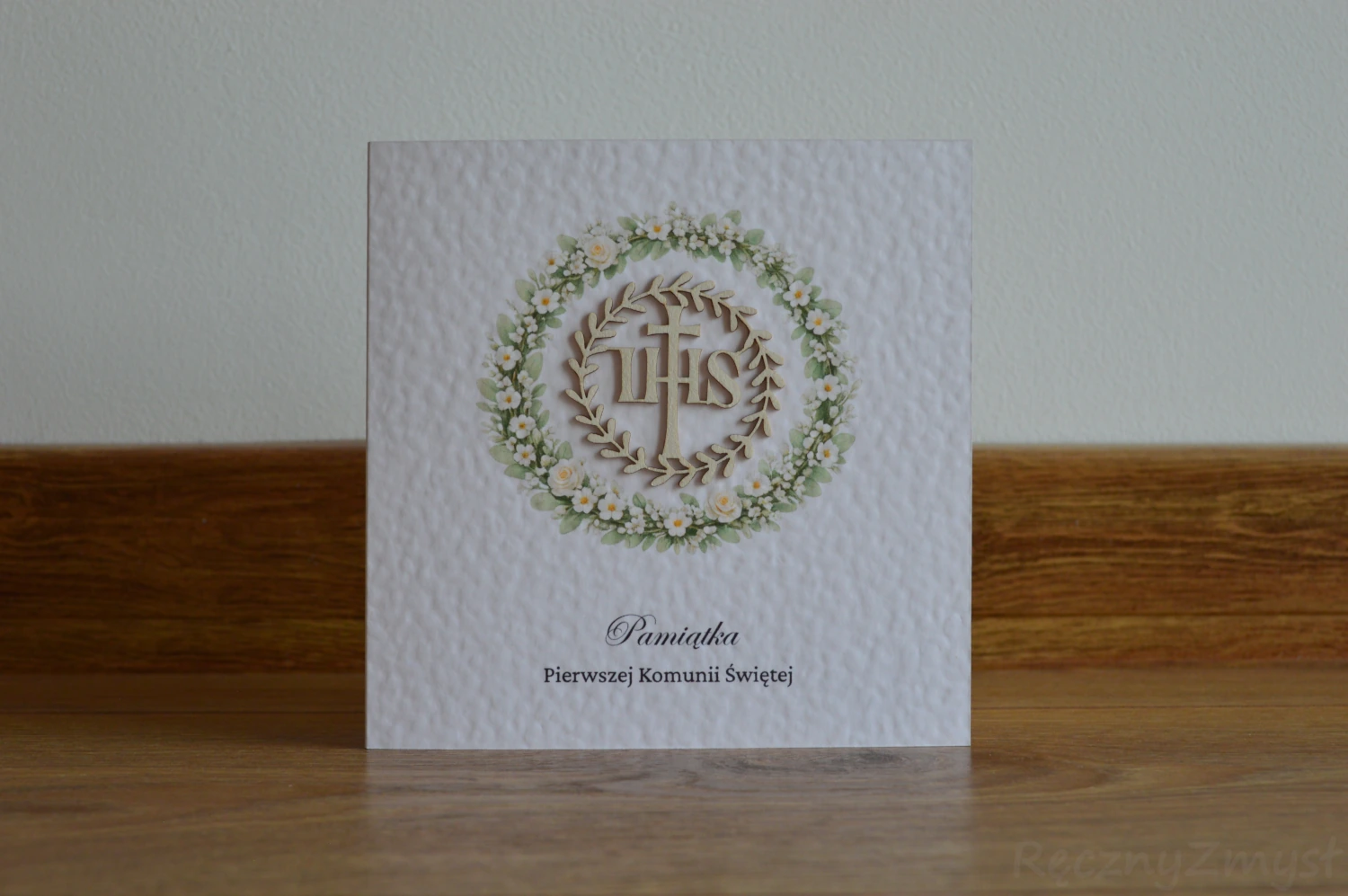 Pamiątka Komunia – IHS w wianku z białych kwiatów