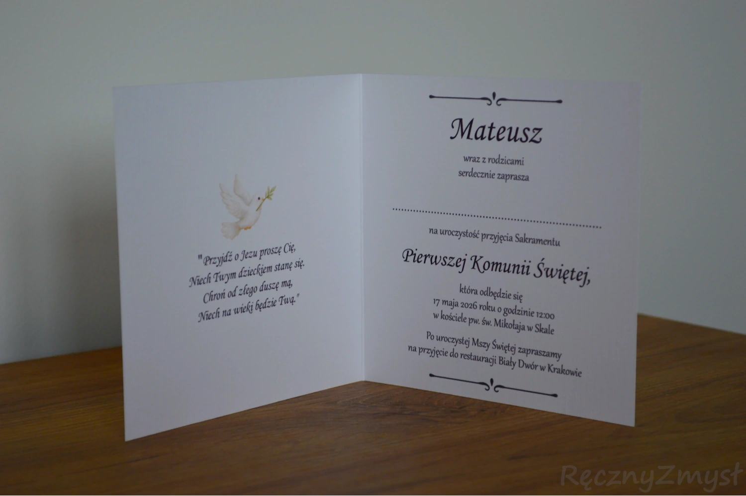 Ręcznie wykonane zaproszenie komunijne przedstawiające chłopca, przygotowane z zielonymi listkami, kielichem, ptakiem z symbolem IHS oraz drobnymi kartonowymi dodatkami. Zaproszenie jest w pełni personalizowane – można zmienić tekst i dodać własne zdjęcie dziecka, co sprawia, że każdy egzemplarz staje się unikalny. Elegancki i subtelny design idealnie wpisuje się w charakter uroczystości Pierwszej Komunii Świętej.