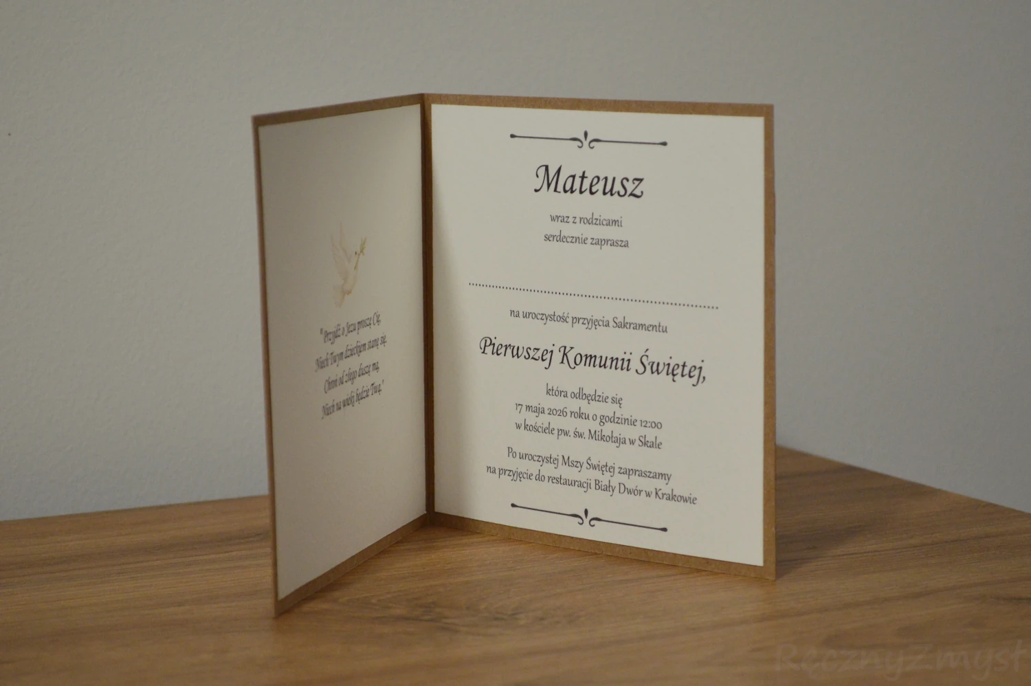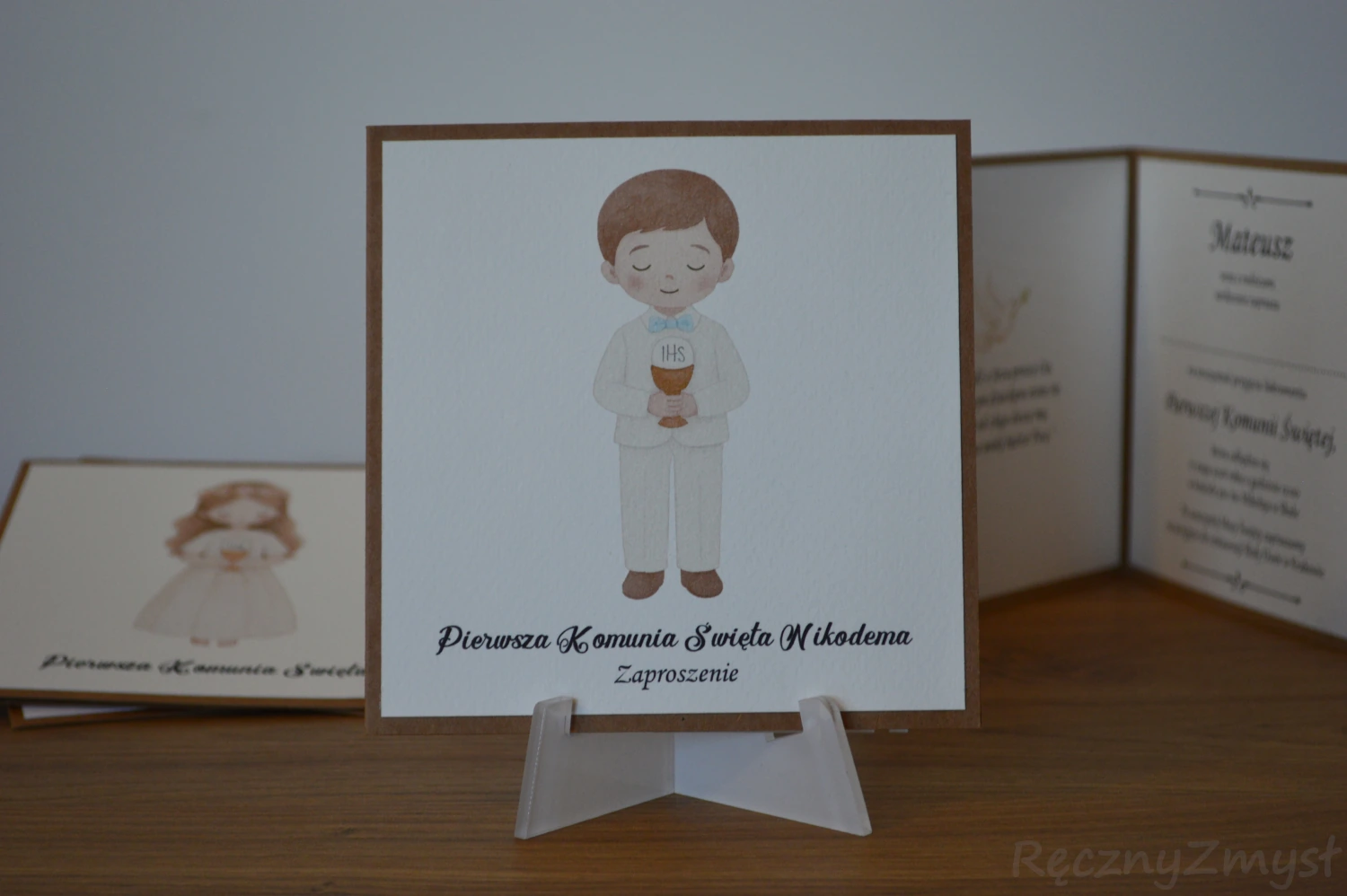 Ręcznie wykonane zaproszenie na pierwszą komunię świętą z chłopcem trzymającym kielich. Każda kartka jest personalizowana według danych podanych przez klienta, co sprawia, że zaproszenie staje się wyjątkową pamiątką uroczystości. Subtelny motyw religijny dodaje kartce uroku i nadaje jej elegancki charakter. W innej ofercie znajduje się kartka okolicznościowa z podobnym motywem dla dziewczynki.