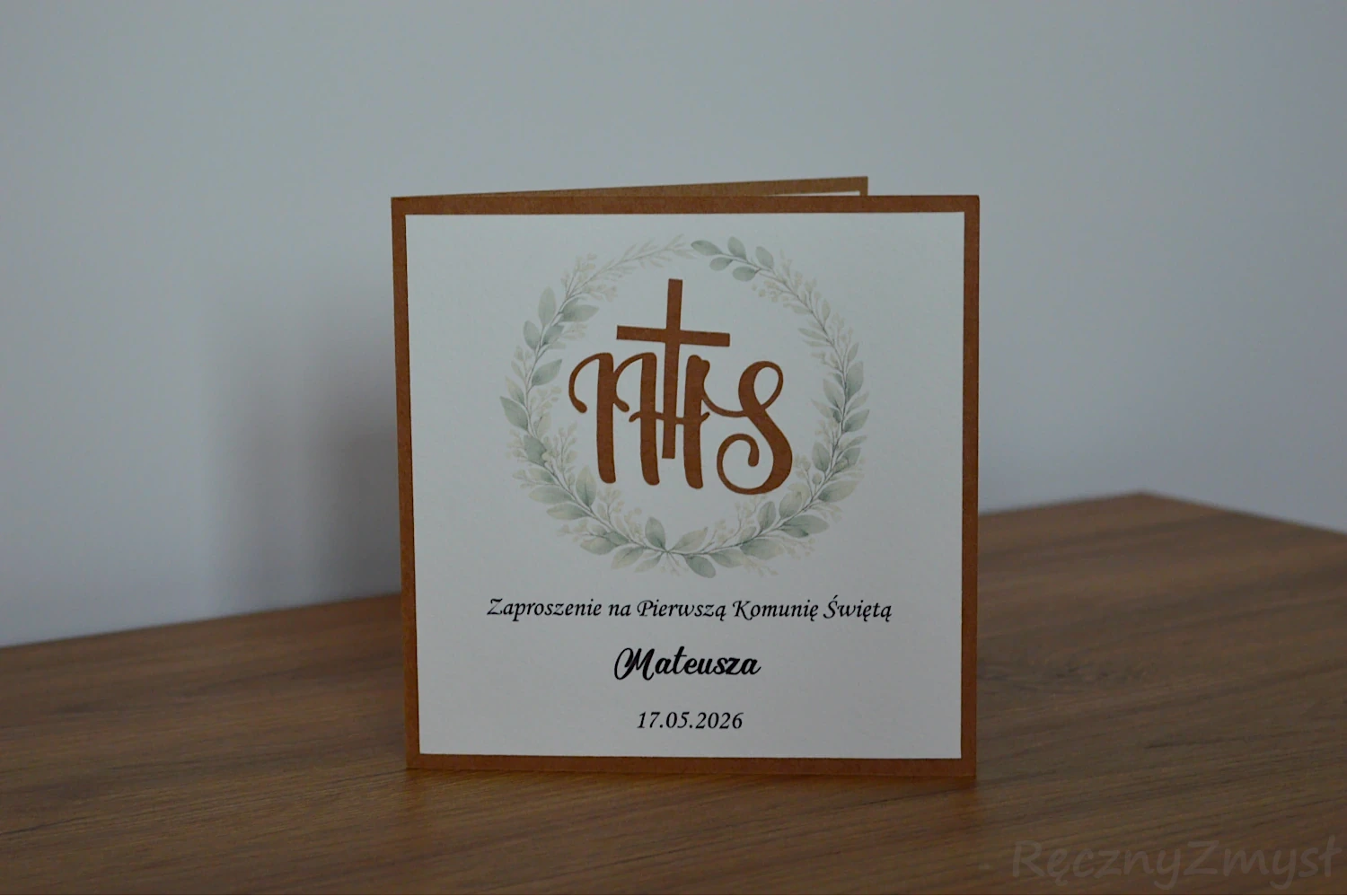 Ręcznie wykonane zaproszenie na pierwszą komunię świętą z delikatnym zielonym wiankiem i symbolem IHS. Kartka przygotowana na kartonowej podstawie, z subtelnym motywem komunijnym. Idealne dla dziewczynki i chłopca. Każde zaproszenie jest personalizowane według danych podanych przez klienta, dzięki czemu stanowi wyjątkowy sposób zaproszenia gości na uroczystość Pierwszej Komunii Świętej.